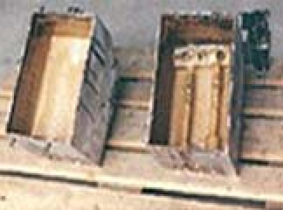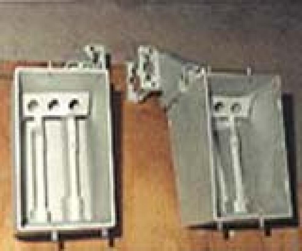 Bilderna visar limlådor av gjuten aluminiumlegering som används hos planmöbeltillverkningsindustrier. I bilden längst till vänster ser man lådorna före avbränning i fluidiseringsbädden medan bilden till höger visar resultatet efter rengöring och blästring med glaspärlor.